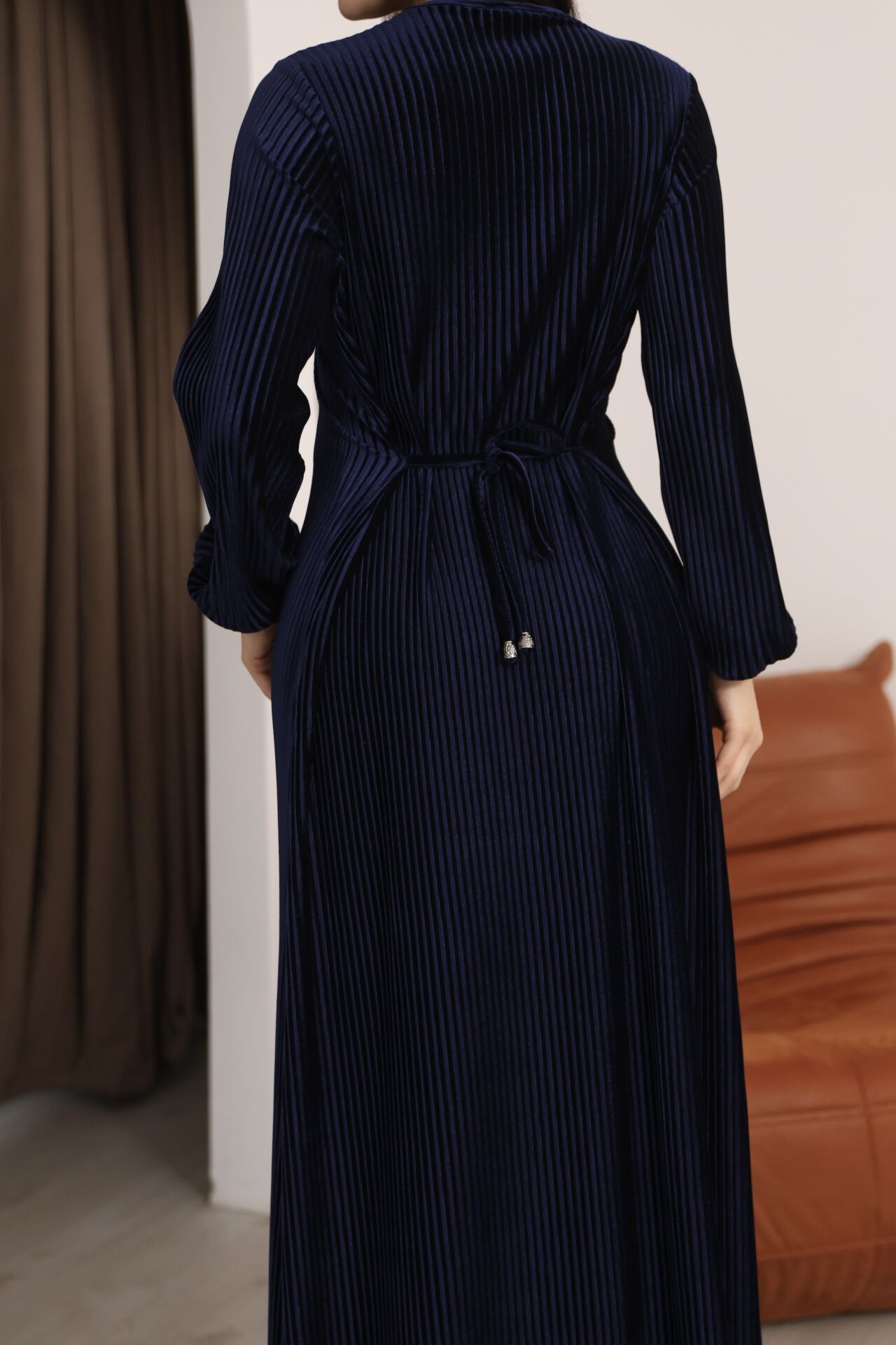 Lacivert Multi Plise Elbise Uzun Kollu Bisiklet Yaka Bağcık Detaylı Rahat Elbise